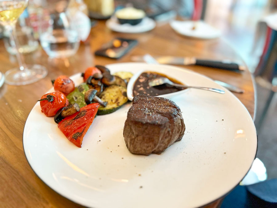 Japanski A5 wagyu ramstek servira se u kockama, na vrućem tanjuru, s nekoliko kodimenata i čipsom od češnjaka. Premda nije tanko, meso ne treba rezati. Ono je doslovno putraste teksture, s vrlo snažnim okusom goveđeg ekstrakta. Iako je porcija relativno velika za kriterije serviranja wagyua, ovaj se steak ne može prestati jesti doslovno do zadnjeg griza.