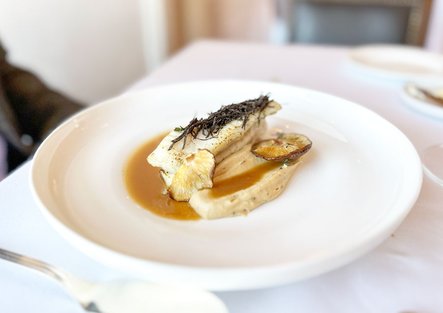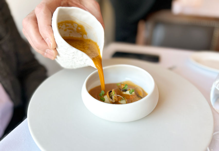 Jedno od predjela, bakalarove tripice, u cijelosti se oslanja na tu namirnicu, koja u interpretaciji Esplanadine chefice poprima finu teksturu svježih liganja. Juha od kestena servira se s paštetom od janjećih iznutrica, koja izgleda poput foie gras, dok se poširano jaje s tartufima poslužuje s telećim brizlama. No, najukusnije jelo koje smo danas probali bila je gusta juha s triljom i dagnjama.